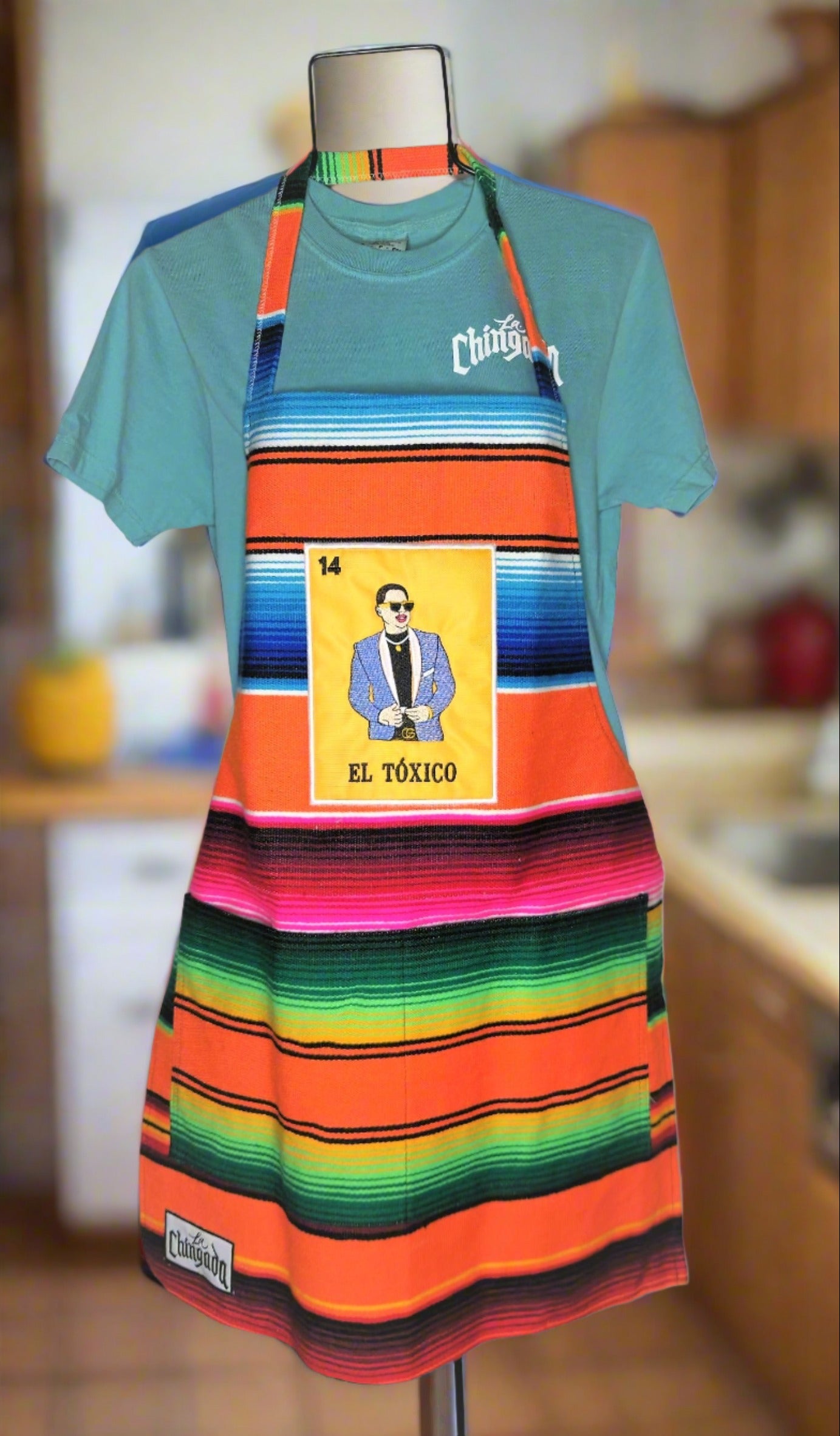 Get ready to cook in style with our Lotería Apron! This apron features a vibrant zarape design and an embroidered lotería patch, making it both functional and fashionable.
